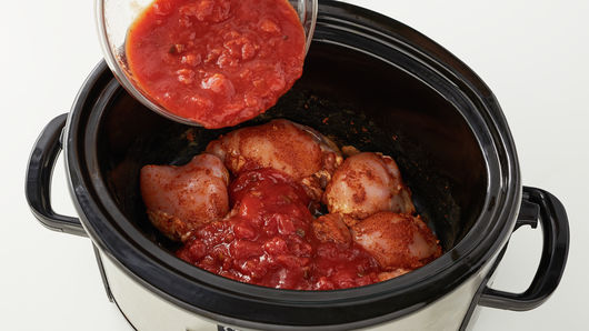 Top chicken with salsa. Stir until well combined. Cover; cook on Low heat setting 4 to 4 1/2 hours or until chicken is very tender (at least 165°F).